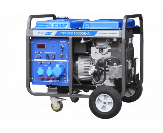 Бензогенератор с электростартом и блоком автоматики однофазный 10 кВт TSS SGG 10000 EHА предназначен для выработки электроэнергии с основными характеристиками: напряжение - 220 вольт, частота 50 Гц, оснащенный колесным комплектом, для удобства передвижения.