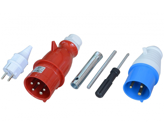 - Розетки: Розетки: 220В – 16А, 1 шт., 220В – 32А, 1 шт. ( промышленная) и 380В – 32А, 1 шт.( промышленная), что позволяет подключать разные электроинструменты