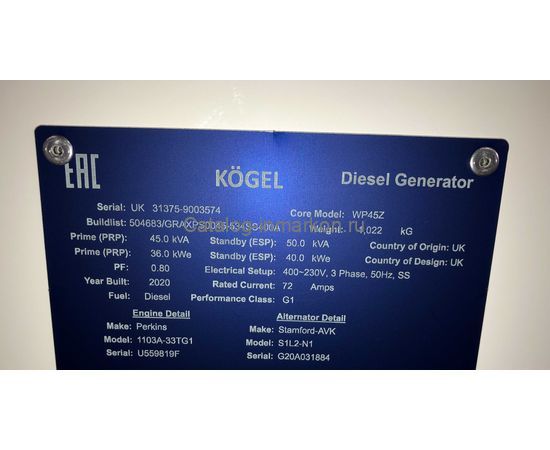 Дизель генератор KÖGEL ном. мощность - 45 кВА/36 кВт, резервная мощность - 50 кВА/40 кВт. Дизель низкооборотный 1500 об\мин жидкостного охлаждения Perkins (производство Великобритания).