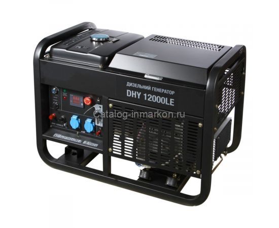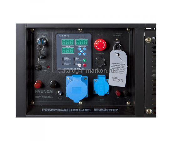 Hyundai DHY 12000LE - однофазный дизельный генератор номинальной мощностью 10 кВт и частотой 50 Гц. Оснащен двигателем Hyundai D1000 мощностью 15 кВт. Топливный бак объёмом 25 л. обеспечивает автономную работу генератора при 50% нагрузке 10,3 часов. Запуск генератора ? электростартер.