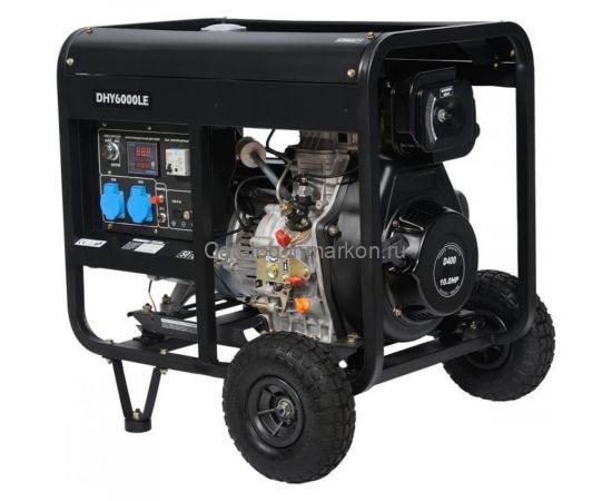 Hyundai DHY 6000LE - однофазный дизельный генератор номинальной мощностью 5 кВт и частотой 50 Гц. Оснащен двигателем Hyundai D400 мощностью 7,3 кВт. Топливный бак объёмом 14 л. обеспечивает автономную работу генератора при 50% нагрузке 12,7 часов. Запуск генератора ? ручной/электростартер.