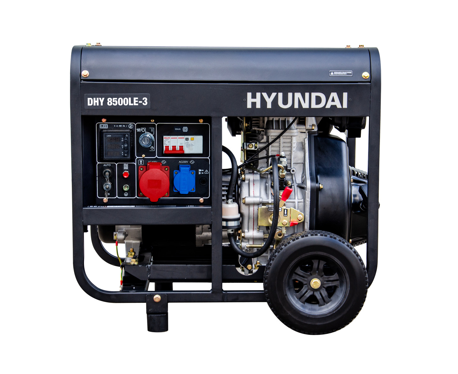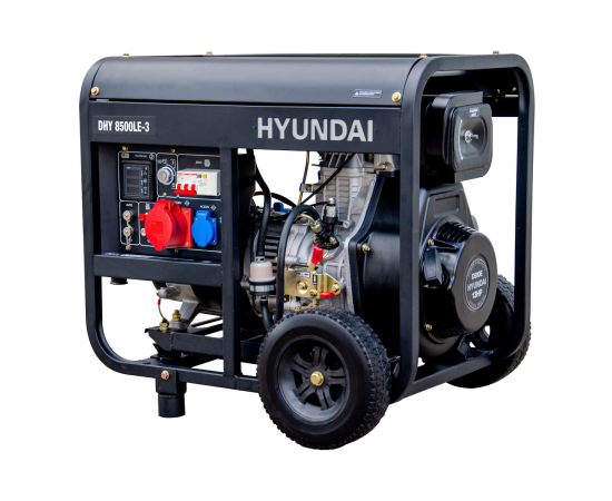 Hyundai DHY 8500LE-3 - трёхфазный дизельный генератор номинальной мощностью 6,5 кВт и частотой 50 Гц. Оснащен двигателем Hyundai D500E мощностью 9,5 кВт. Топливный бак объёмом 14 л. обеспечивает автономную работу генератора при 50% нагрузке 11,1 часов. Запуск генератора ? ручной/электростартер.