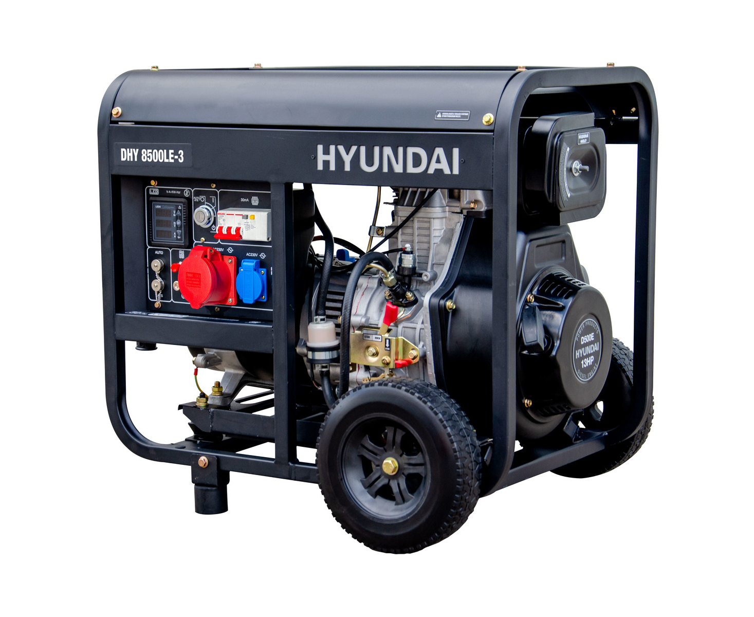 - двигатель Hyundai D500E - дизельный 4-тактный, с воздушным охлаждением, мощностью 9,5 кВт и с частотой вращения 3000 об/мин, с центробежным регулятором оборотов;