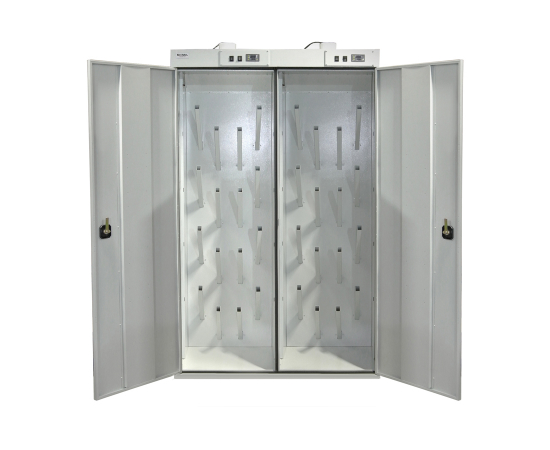 Сушильный шкаф ШС-4-16 ср предназначен для сушки 16 пар обуви. Поток теплого воздуха, создаваемый в сушильном шкафу, обеспечивает эффективный процесс просушивания обуви за минимальное время и без повреждения материалов. Шкаф имеет две независимые секции, позволяющие использовать их по мере наполнения.