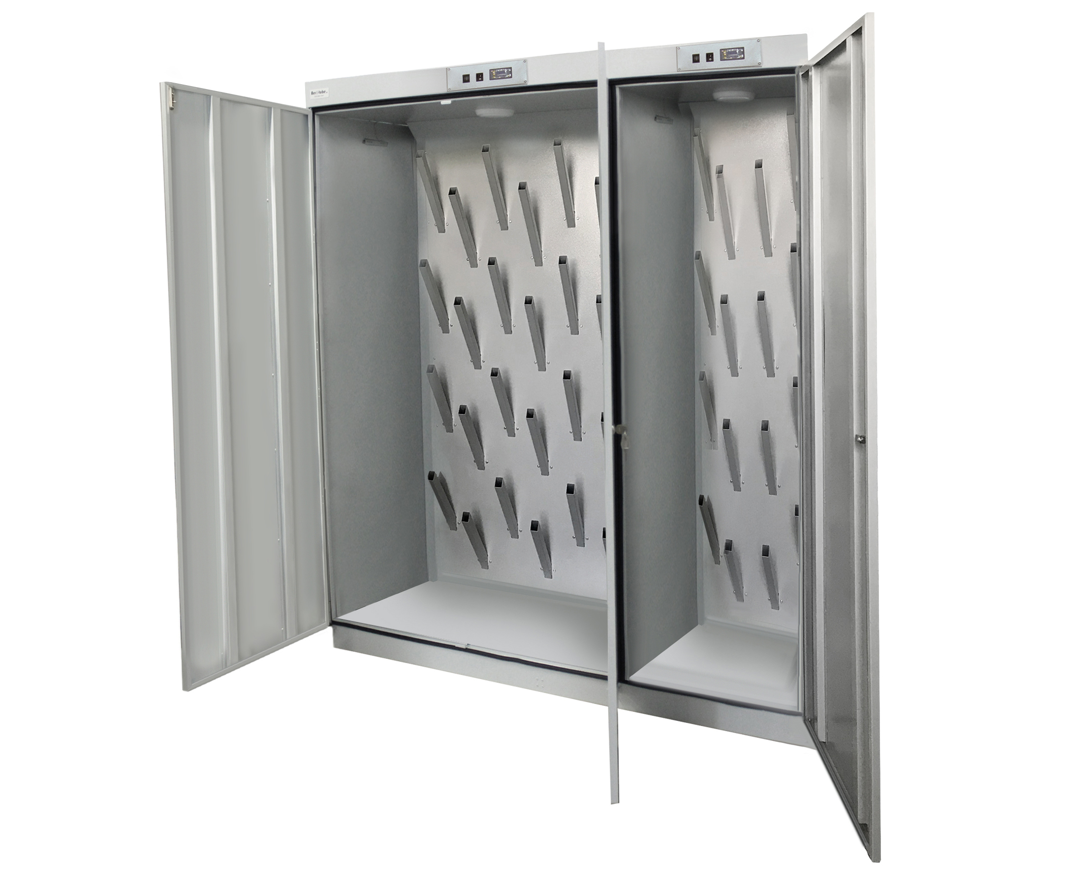 Модель двухсекционного шкафа ШС-8-24 ср отличается повышенной жесткостью конструкции, а также лучшей износостойкостью подвижных элементов. Сушильный шкаф оснащен двумя керамическими нагревательными элементами мощностью 2кВт каждый, вентилятором для нагнетания воздуха в шкаф. Каждая секция имеет свой блок управления с программируемым таймером. Для обеспечение пожарной безопасности сушильный шкаф снабжен системой защиты от перегрева. В конструкции изделия предусмотрен ограничительный термостат с датчиком, позволяющий ограничить температуру подаваемого воздуха. Конструктивно шкаф имеет возможность присоединения к системе вытяжной вентиляции индивидуально для каждой секции.