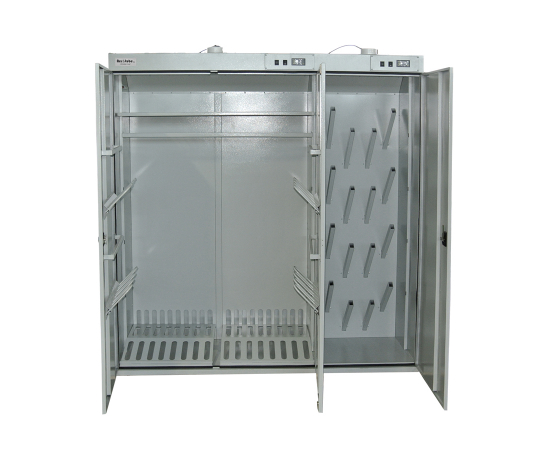Модель двухсекционного шкафа ШС-8 отличается повышенной жесткостью конструкции, а также лучшей износостойкостью подвижных элементов. Сушильный шкаф оснащен двумя керамическими нагревательными элементами мощностью 2кВт каждый, вентилятором для нагнетания воздуха в шкаф. Каждая секция имеет свой блок управления с программируемым таймером. Для обеспечение пожарной безопасности сушильный шкаф снабжен системой защиты от перегрева. В конструкции изделия предусмотрен ограничительный термостат с датчиком, позволяющий ограничить температуру подаваемого воздуха. Конструктивно шкаф имеет возможность присоединения к системе вытяжной вентиляции индивидуально для каждой секции.