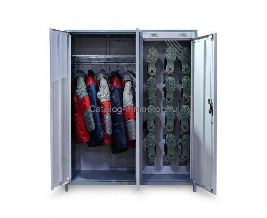 В стандартной комплектации внутри шкафа установлены: в секции для одежды съемная сетчатая полка и штанга для вешалок, в секции для обуви - 12 воздухоподводящих патрубков для навешивания обуви.