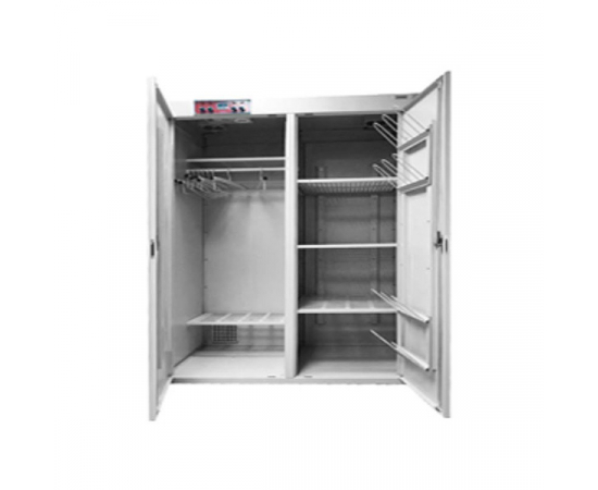Шкаф сушильный РШС-02И двухсекционный, имеет сборную конструкцию. Данная модель шкафа оснащена инфракрасным нагревательным элементом и ионизатором, а также простым в использовании блоком управления с таймером и цифровым терморегулятором. Для обеспечение пожарной безопасности сушильный шкаф снабжен системой защиты от перегрева. Конструктивно имеется возможность присоединения к системе вытяжной вентиляции.