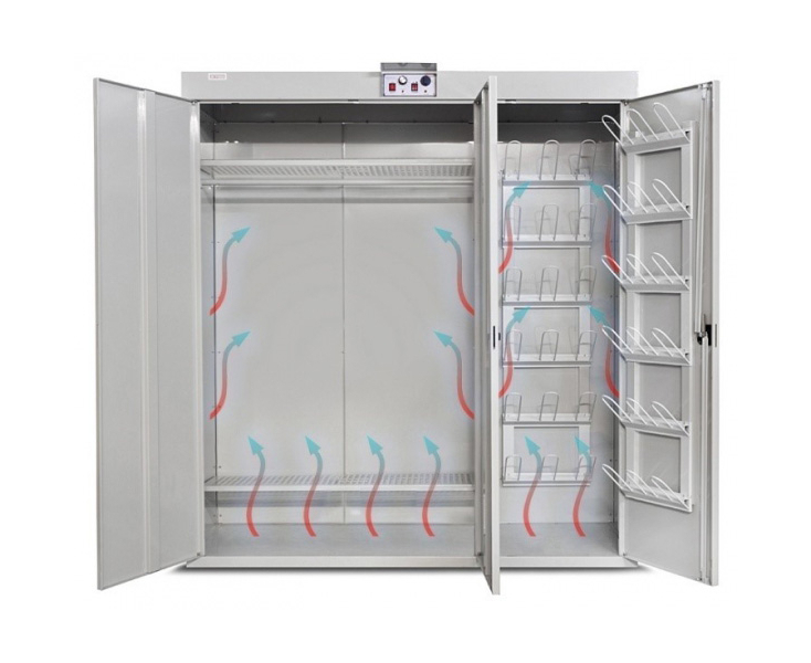 Сушильный шкаф РШС-01И предназначен для сушки 9 комплектов зимней одежды, обуви и аксессуаров (или 18 комплектов летней одежды). Поток теплого воздуха, создаваемый в сушильном шкафу, обеспечивает эффективный процесс просушивания одежды за минимальное время. Сушильный шкаф не сжигает кислород воздуха, безвреден для здоровья, так как в нем использованы экологически чистые материалы.
