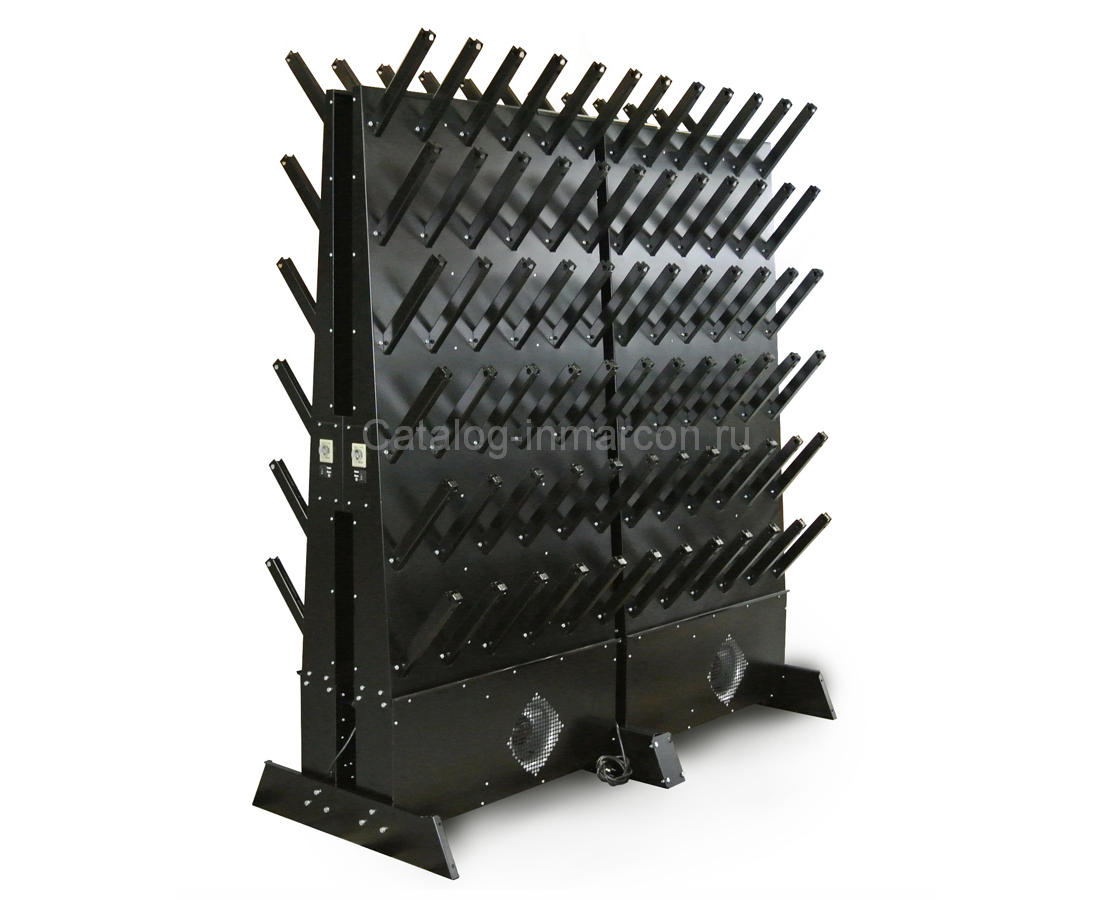 Сушильная стойка СО-72 С состоит из 4-х модулей по 18 пар кронштейнов, каждый из которых имеет свой пульт управления и независимо подключается к однофазной электросети. В данной модели модули располагаются спина к спине. Каждый блок оснащен керамическим нагревателем с вентилятором в сборе и индивидуальным блоком управления с таймером, который позволяет выставить продолжительность работы. Безопасность работы электрооборудования обеспечивается наличием термостата защиты, который отключает нагреватель в случае превышения температуры. Сушильные стойки серии СО могут работать в режиме обдува холодным воздухом и воздухом с нагревом. В данной модели предусмотрена одна ступень нагрева мощностью 12 кВт. Оборудование подключается к однофазной электросети 220В посредством кабеля с вилкой (каждый модуль индивидуально).