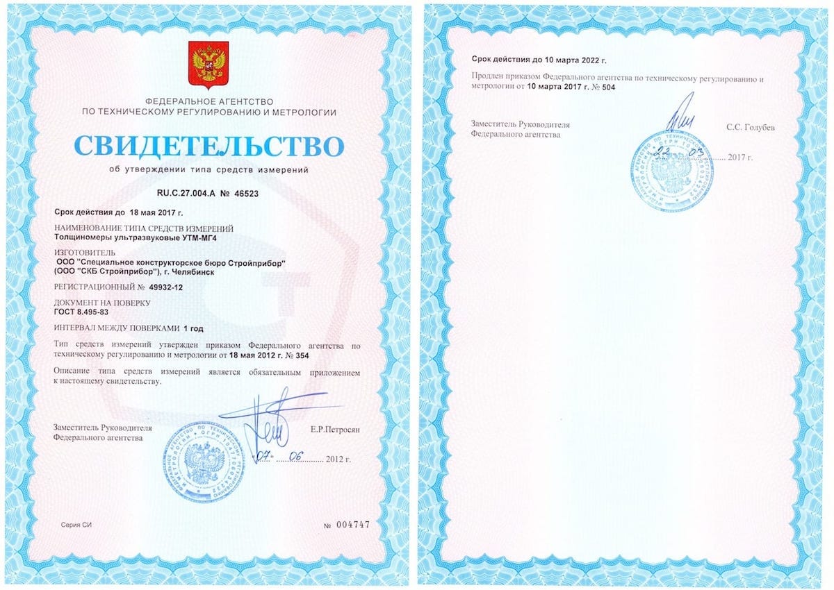 Толщиномеры до ввода в эксплуатацию, а также после ремонта подлежат первичной поверке, а в процессе эксплуатации – периодической поверке. Поверка толщиномера проводится в соответствии с ГОСТ 8.495-83 «Толщиномеры ультразвуковые контактные. Методы и средства поверки»