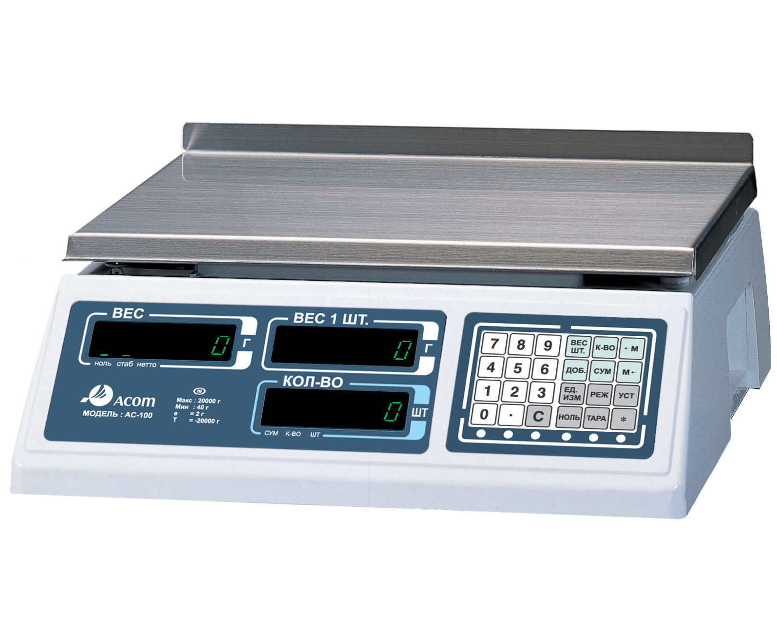 Счетные электронные весы Acom AС-100-5 RS232C ? предназначены для измерения массы. Принцип действия весов основан на преобразовании деформации упругого элемента весоизмерительного тензорезисторнго датчика, возникающей под действием силы тяжести взвешиваемого объекта, в аналоговый электрический сигнал, изменяющийся пропорционально массе груза. Далее этот сигнал преобразуется в цифровой, затем обрабатывается и результат взвешивания выводится на дисплей. С помощью клавиатуры или путем взвешивания партии заранее известного количества предметов вводится значение массы одного предмета и на дисплее отображается количество этих предметов и их общая масса.