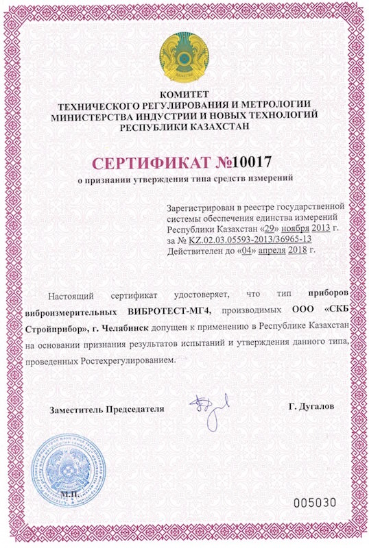 Сертификат о признании утверждения средств измерений. Республика Казахстан (KZ_certif_vibrotest.jpeg, 168 Kb) [Скачать]