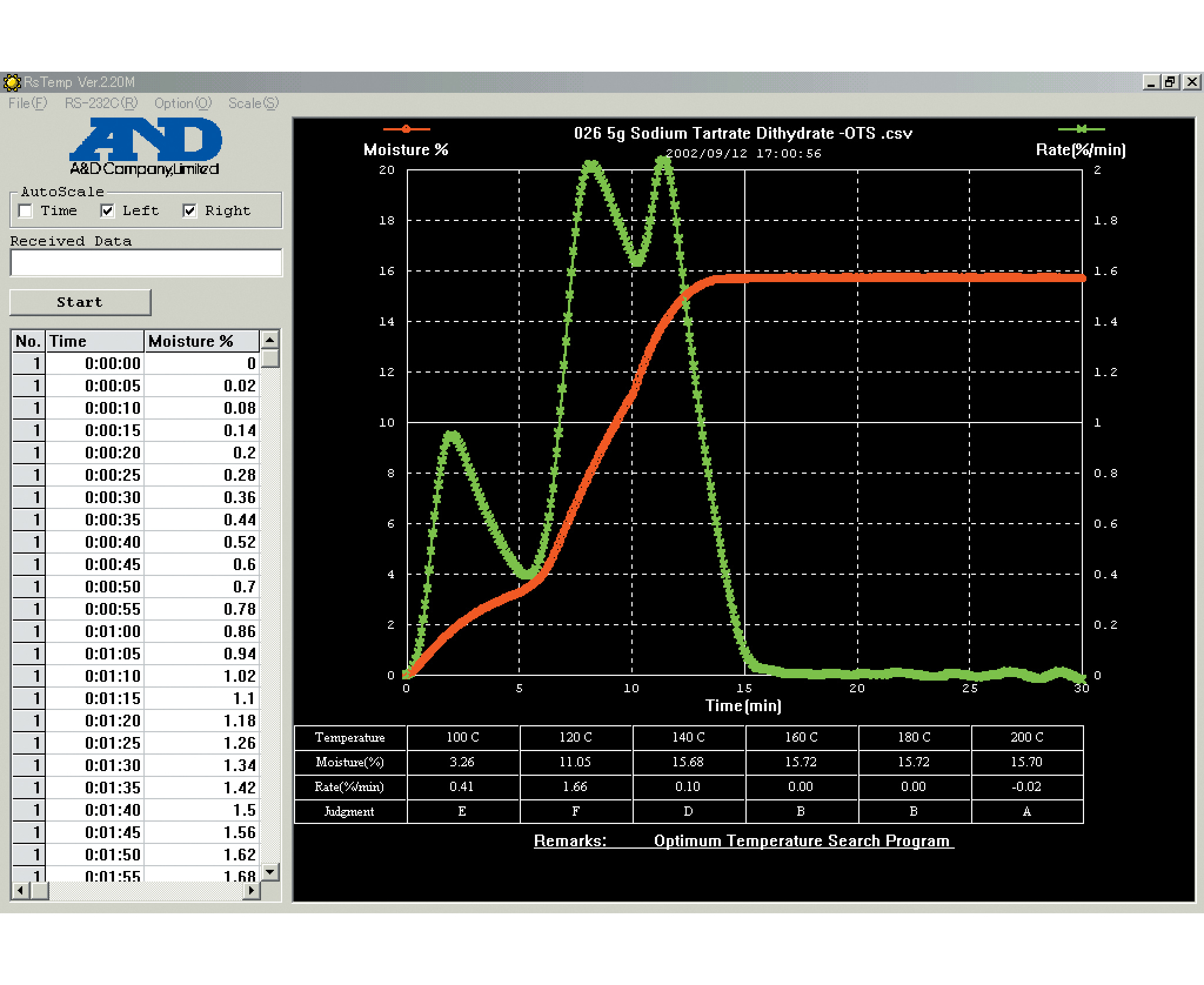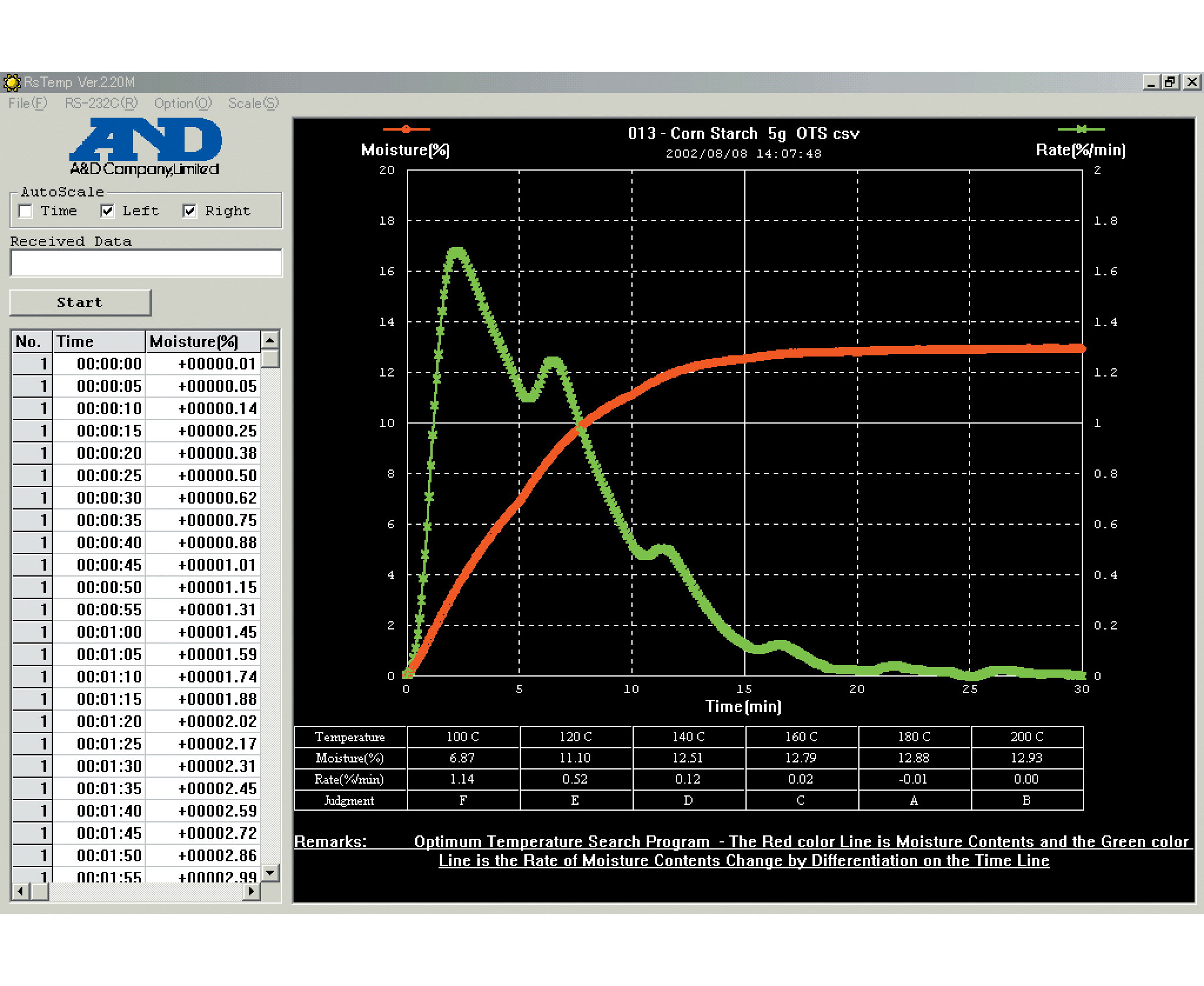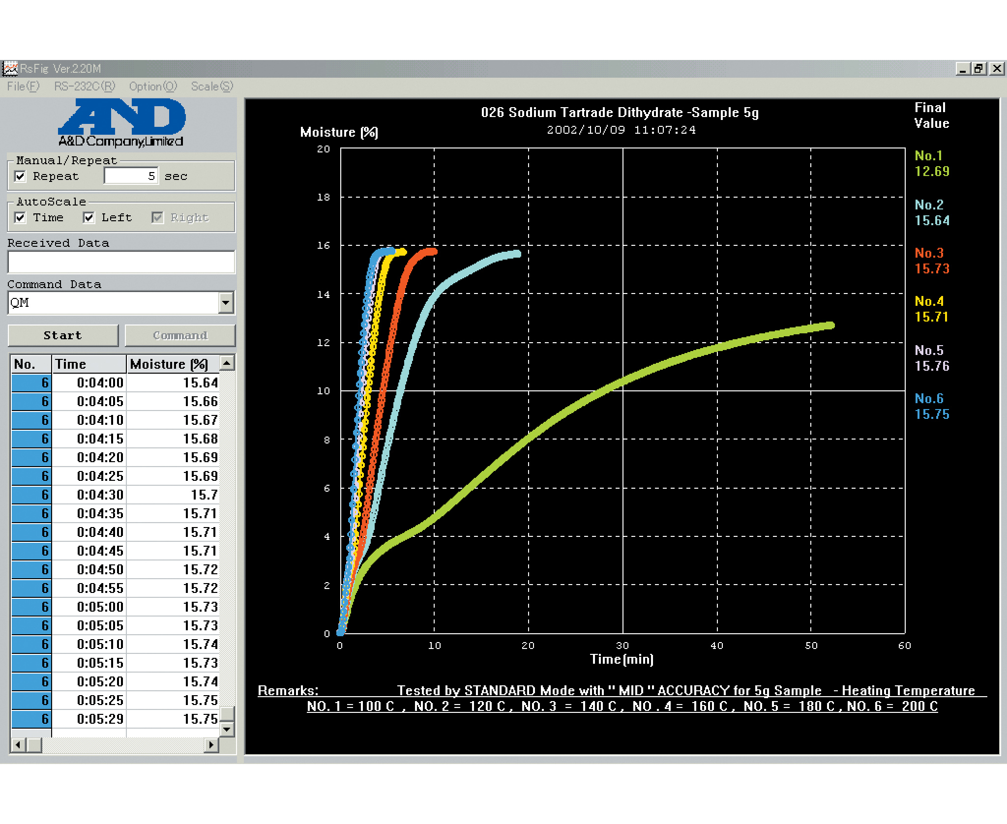 - ускоренный (образец нагревается до 200 °С, затем температура снижается до заданного значения; ввод данных: температура, размер образца HI/MID/LO (10/5/1г), измерение автоматически прекращается при достижении полстоянной массы