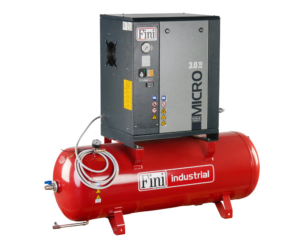 Серия FINI MICRO это воздушные винтовые компрессоры с мощностью двигателя от 2.2 кВт до 5,5 кВт, рабочим давлением 8-13 атм. Присоединительный размер ? 1/2?. Возможна как поставка компрессора на раме, так и в исполнении на ресивере, на ресивере с осушителем.