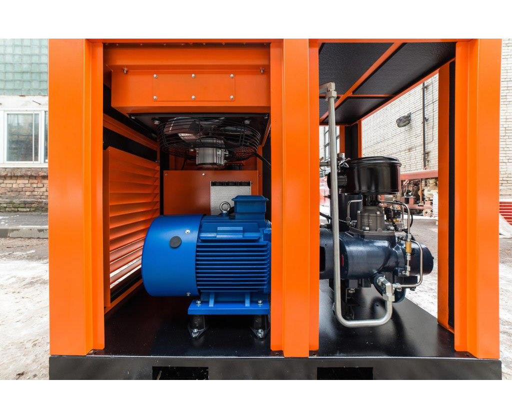 Электродвигатель установлен на лапах и крепится болтами к раме через амортизаторы. На валу электродвигателя закреплен шкив для передачи крутящего момента компрессору посредством ременной передачи. Натяжение ремней осуществляется с помощью перемещения компрессорного блока с помощью болтов натяжения.