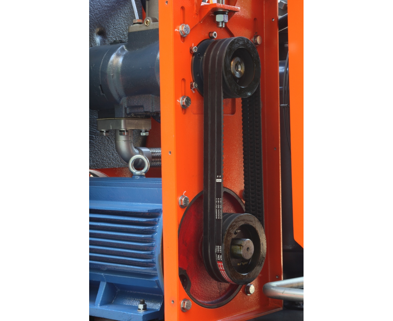 Электродвигатель установлен на лапах и крепится болтами к раме через амортизаторы. На валу электродвигателя закреплен шкив для передачи крутящего момента компрессору посредством ременной передачи. Натяжение ремней осуществляется с помощью перемещения компрессорного блока с помощью болтов натяжения.