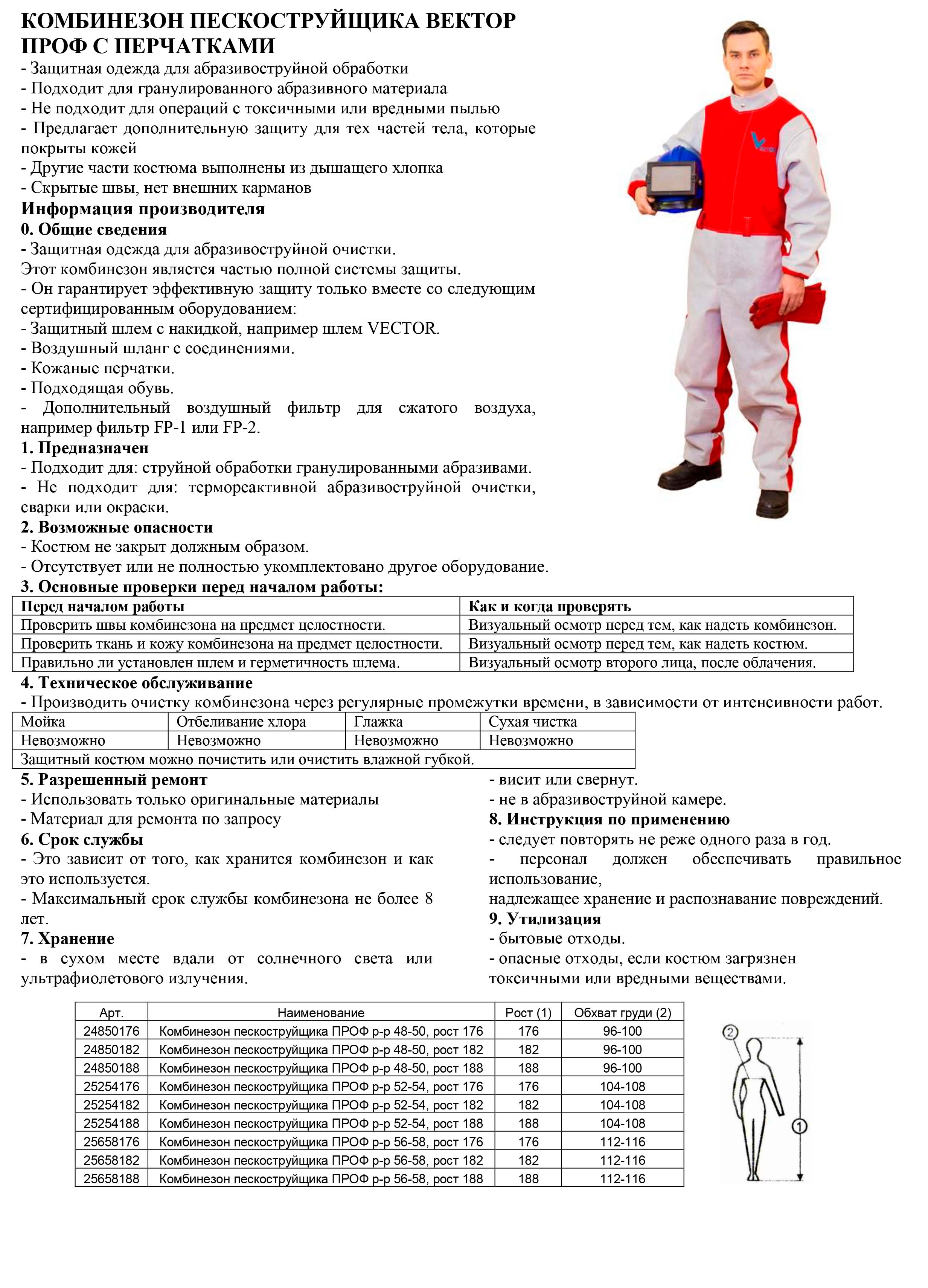 Комбинезон пескоструйщика Вектор ПРОФ с перчатками ТУ 8575-001-28470813-2018 используется для индивидуальной защиты от рикошета частиц абразивного материала при выполнении различных абразивоструйных работ. Комбинезон имеет подкладку из хлопчатобумажной ткани по всей внутренней поверхности. Это преимущество делает работу более комфортной, а сам комбинезон более долговечным. Комбинезон 48-50 размера, для роста 188 см.